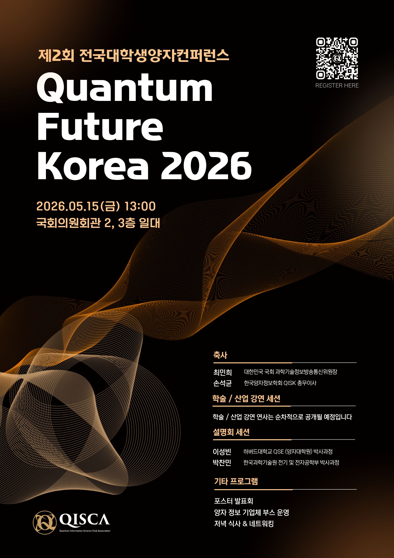 한국대학생양자학회 QISCA가 국회 과학기술정보방송통신위원장님과 함께 2026년 5월 15일 제2회 전국대학생양자컨퍼런스 (Quantum Future Korea 2026)를 공동 주최합니다.