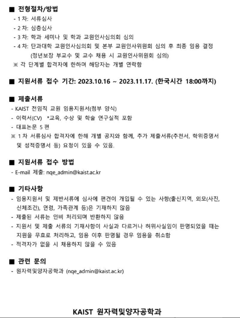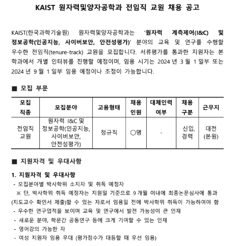KAIST 원자력및양자공학과 전임직 교원 초빙