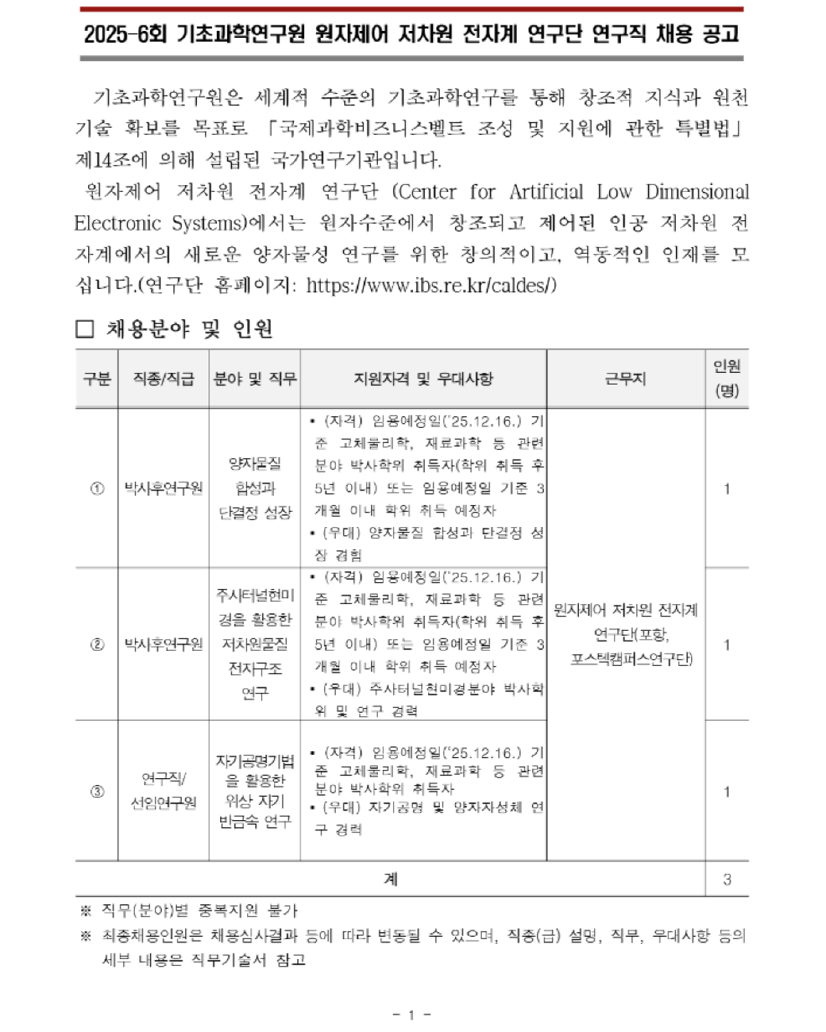 2025-6회 기초과학연구원 원자제어 저차원 전자계 연구단 연구직 채용 공고