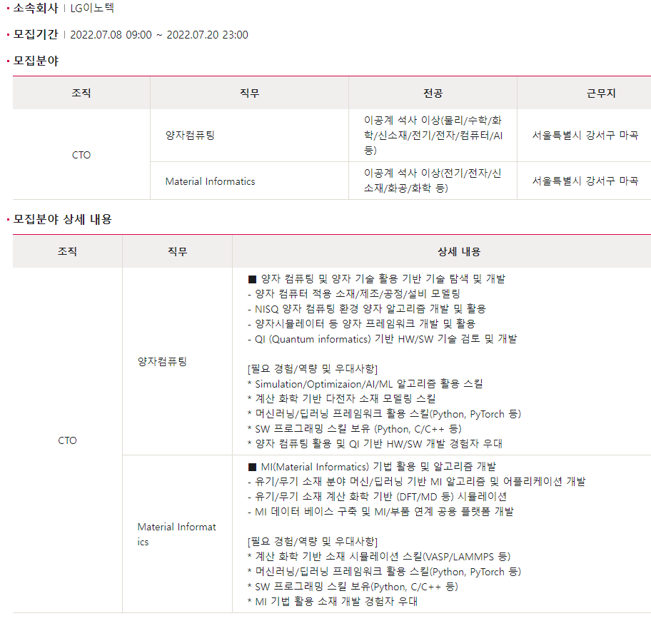 [채용] LG이노텍 양자컴퓨팅 및 MI(Material Informatics) 신입/경력 모집