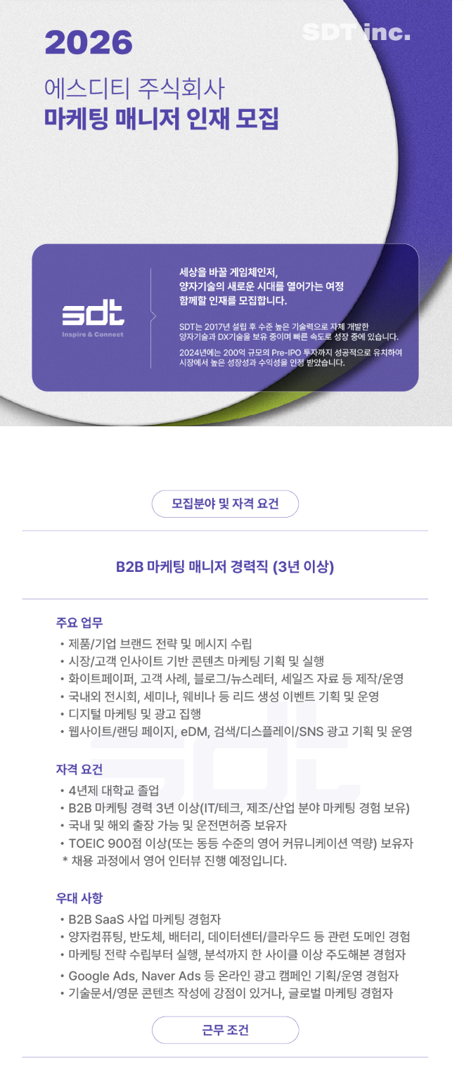 [에스디티(주) 양자표준기술전문기업] B2B 마케팅 경력직 채용