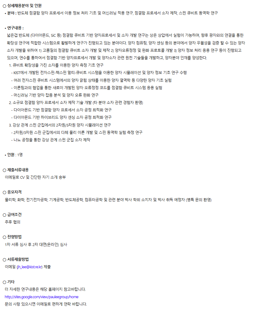 한국과학기술연구원 양자기술연구단 반도체양자연구실 Post-Doc. 모집