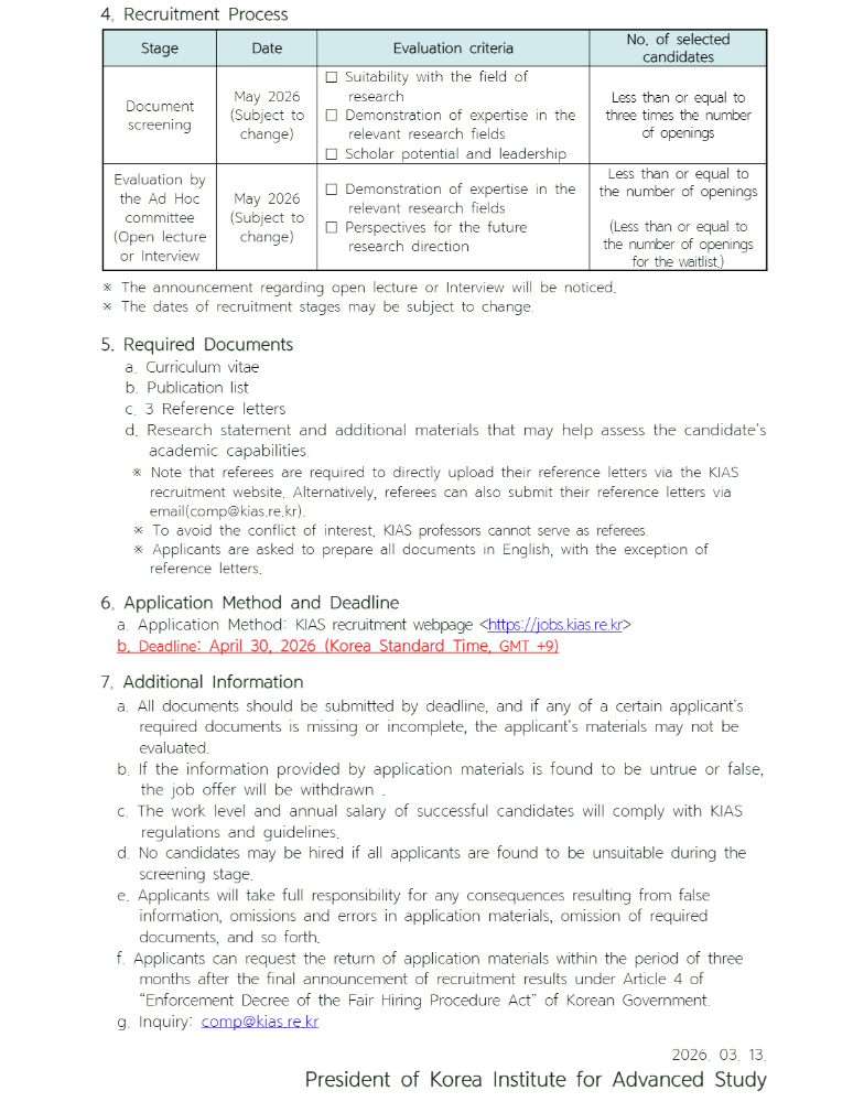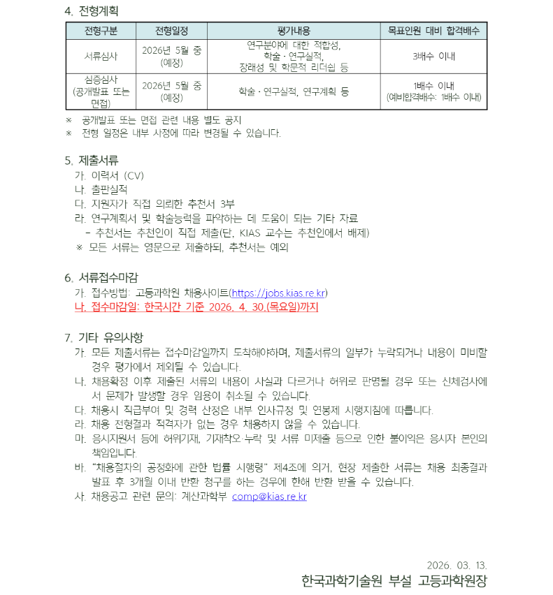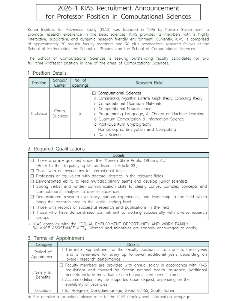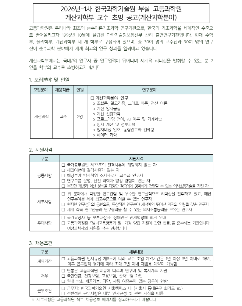 고등과학원 2026년-1차 계산과학부 교수 초빙(계산과학분야)