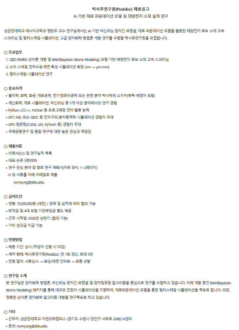 성균관대학교 자연과학캠퍼스 에너지과학과 AI에너지재료연구실 Post-Doc. 모집