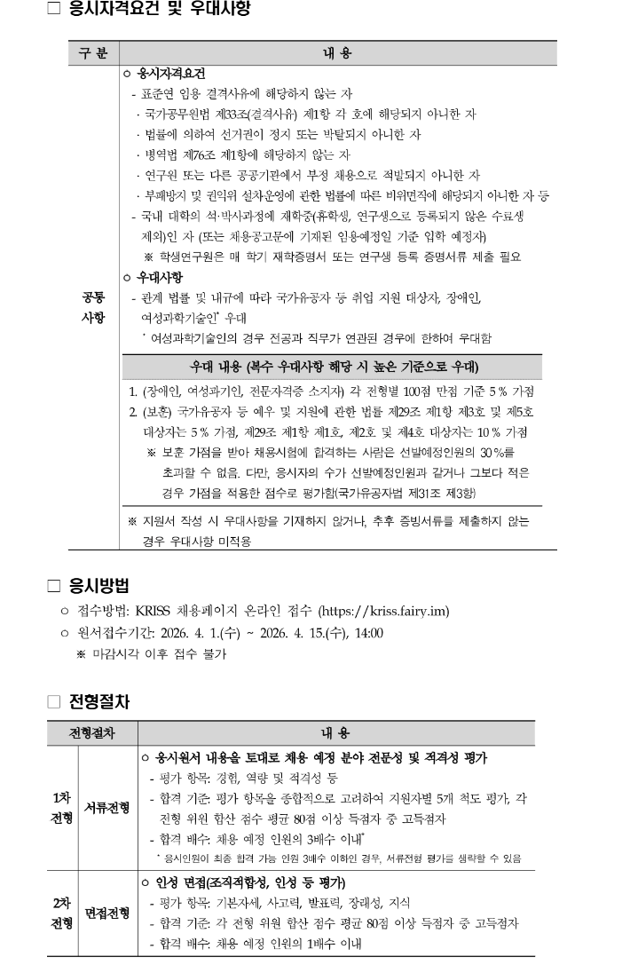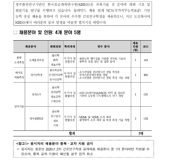 한국표준과학연구원 2026년 2차 근로연구학생 공개채