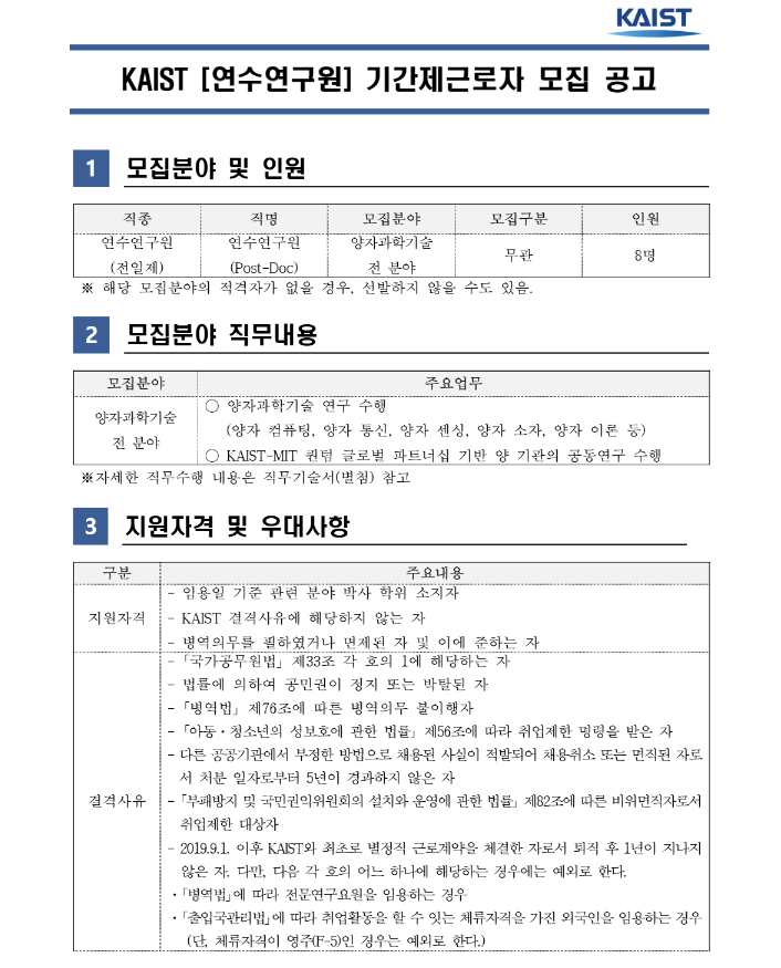 KAIST [KAIST-MIT 양자 혁신센터(CQI)] 연수연구원 모집 공고