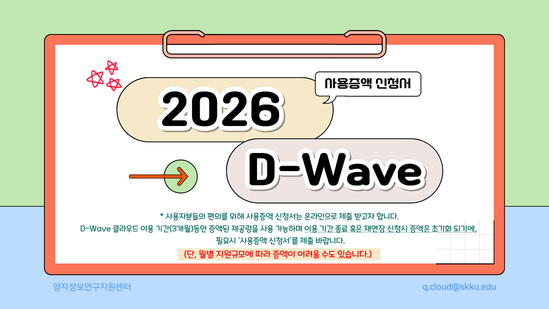 D-Wave 양자컴퓨터 클라우드의 사용 시간은 매달1일 초기화되어 월 300초씩 다시 사용이 가능 합니다.