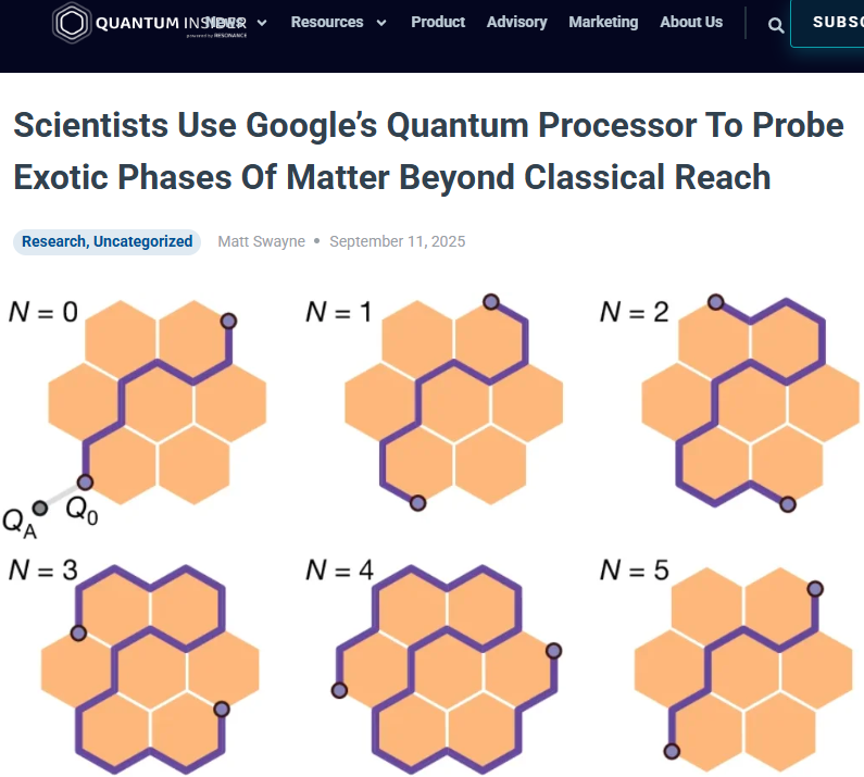 국제 공동 연구진은 구글의 초전도 양자 프로세서를 활용해 “비평형 조건에서만 나타나는 새로운 물질 상(Floquet 위상 질서)”를 구현하고 관측했습니다. 이 과정에서 카이럴 경계 모드와 애니온(anyon) 준입자 같은 독특한 현상을 확인했으며, 이는 고전적 시뮬레이션으로는 재현 불가능한 양자 얽힘 위상임을 보여줍니다. 연구는 양자 프로세서가 화학이나 최적화 문제를 넘어, 새로운 물질 상 발견의 실험실로 활용될 수 있음을 제시하지만, 아직 오류와 규모의 한계로 실용적 응용에는 도달하지 못했습니다.