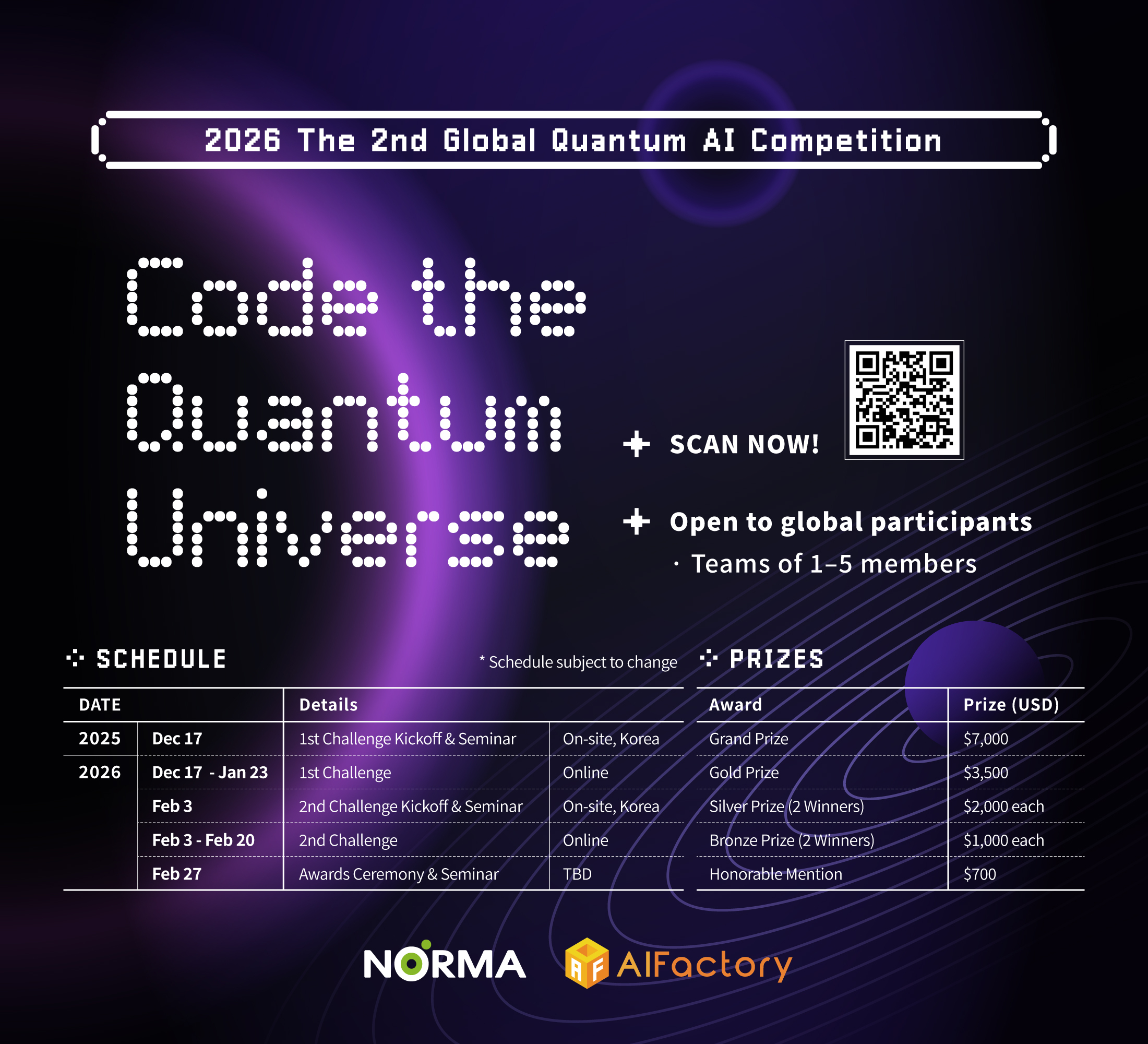 양자 컴퓨팅 기업 노르마에서 아래와 같이 [2026 제 2회 글로벌 퀀텀 AI 경진대회] 를 진행하오니 많은 관심과 참여 부탁드립니다.