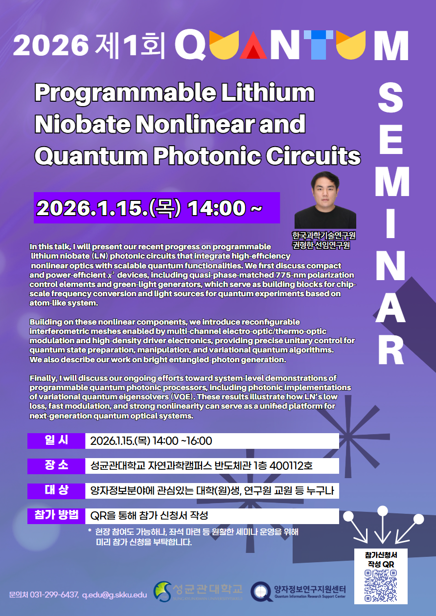 양자정보연구지원센터에서 2026년도 첫 양자정보세미나를 1월에 개최합니다.