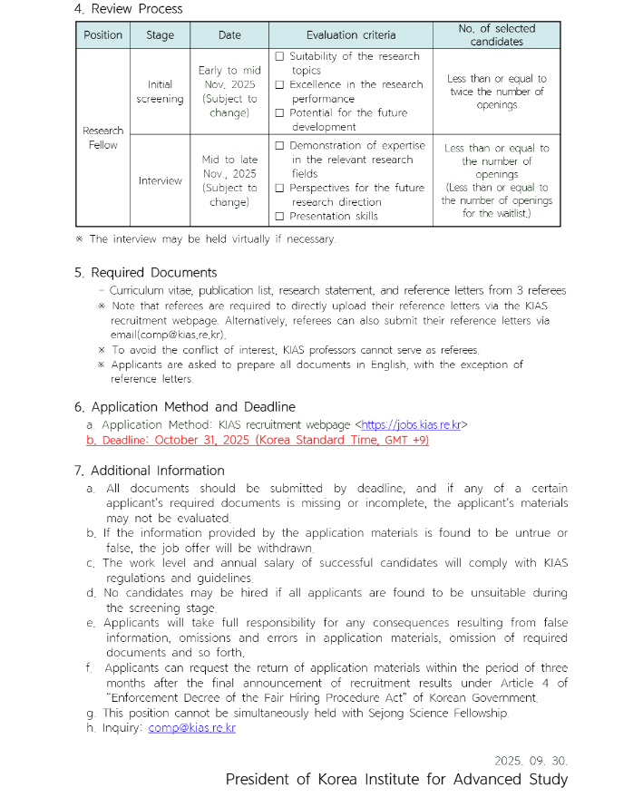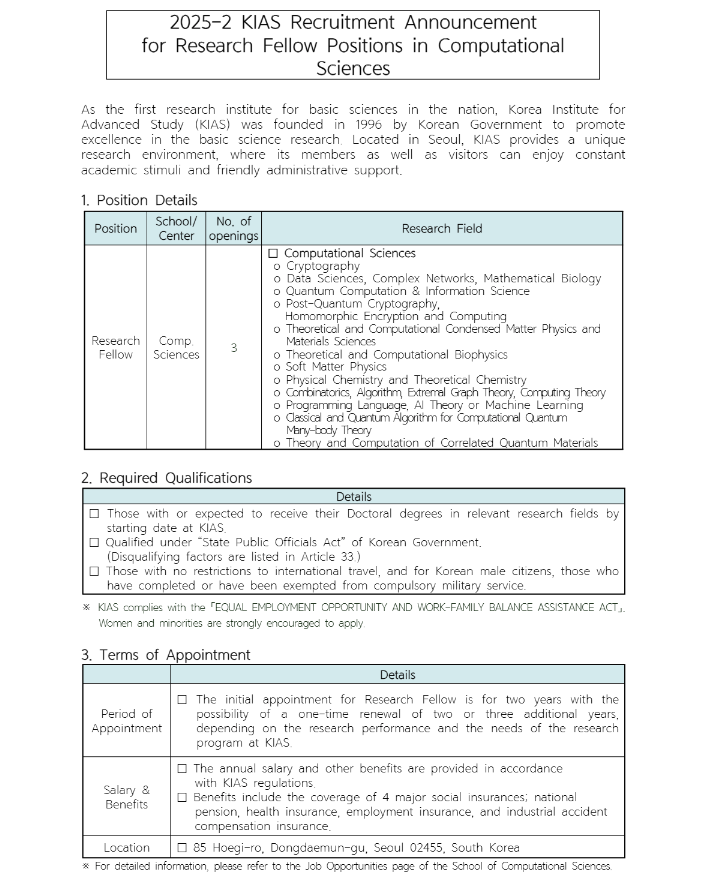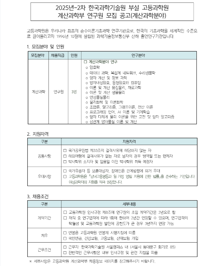 고등과학원 2025년 2차 계산과학부 연구원 모집(계산과학분야)