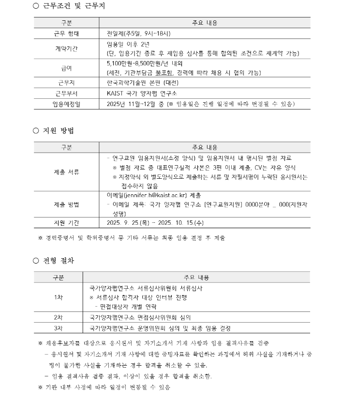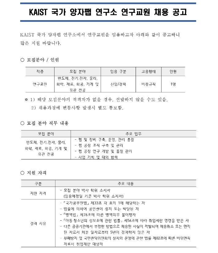 KAIST 국가 양자팹 연구소 연구교원 채용 공고