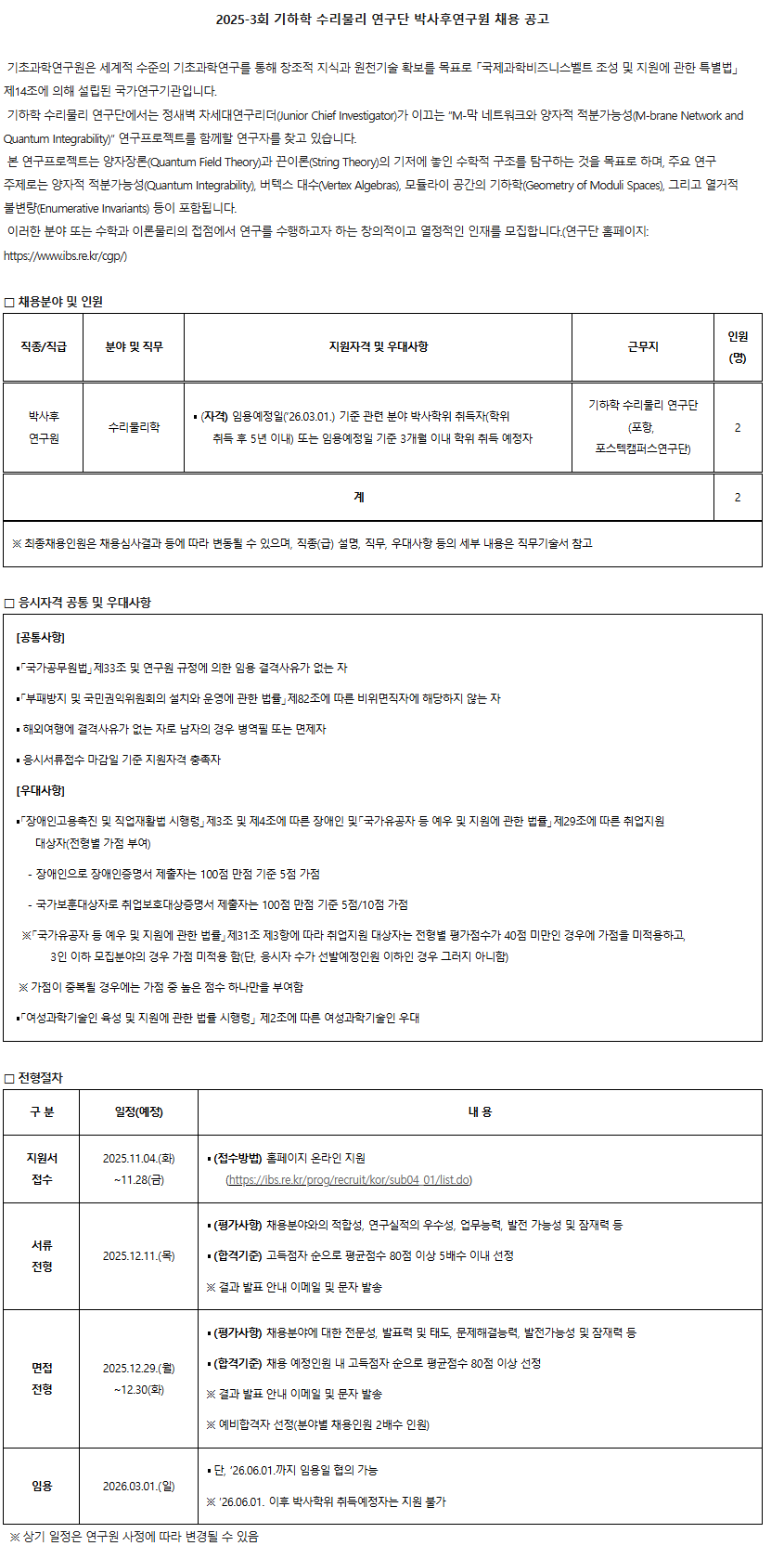 2025-3회 기하학 수리물리 연구단 박사후연구원 채용 공고