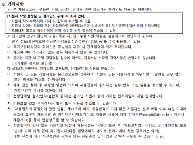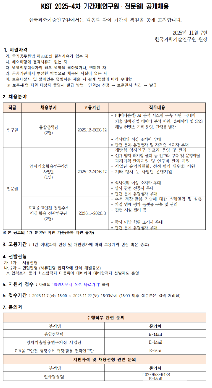KIST 2025-4차 기간제(연구원·전문원) 공개채용