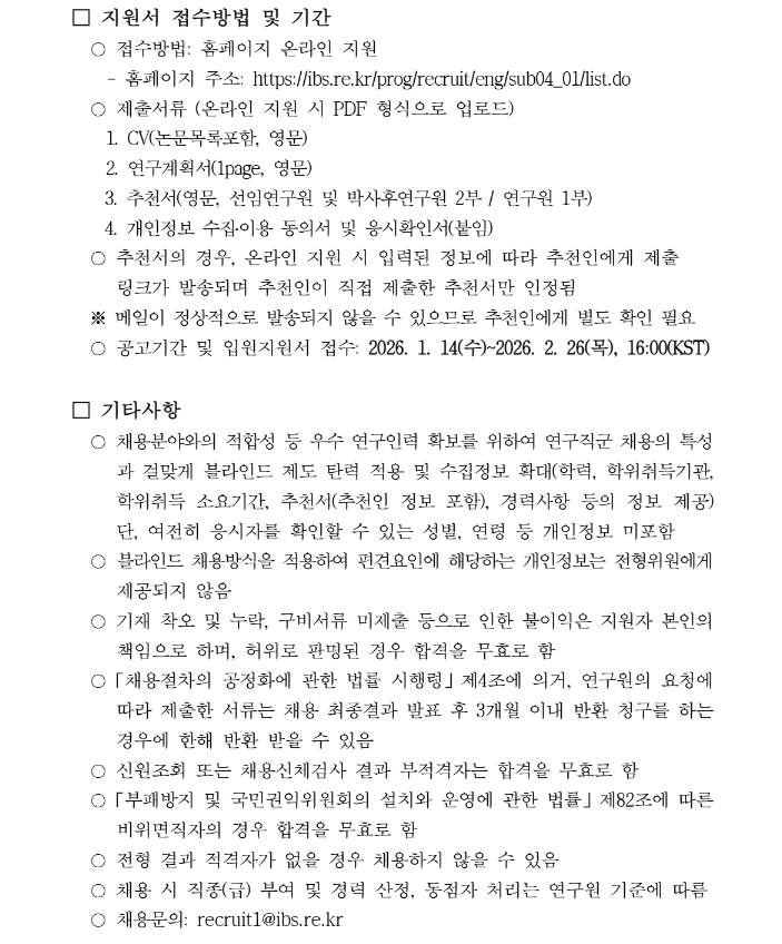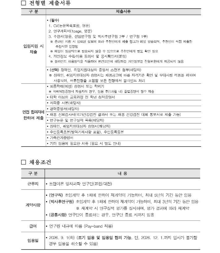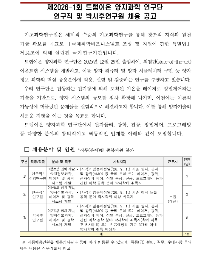제2026-1회 트랩이온 양자과학 연구단 연구직 및 박사후연구원 채용 공고
