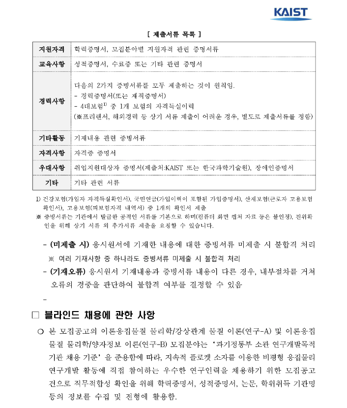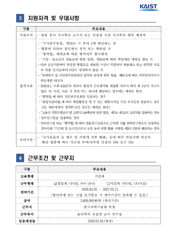 KAIST 물리학과 조길영 교수 연구실 위촉연구원(2인) 모집 공고