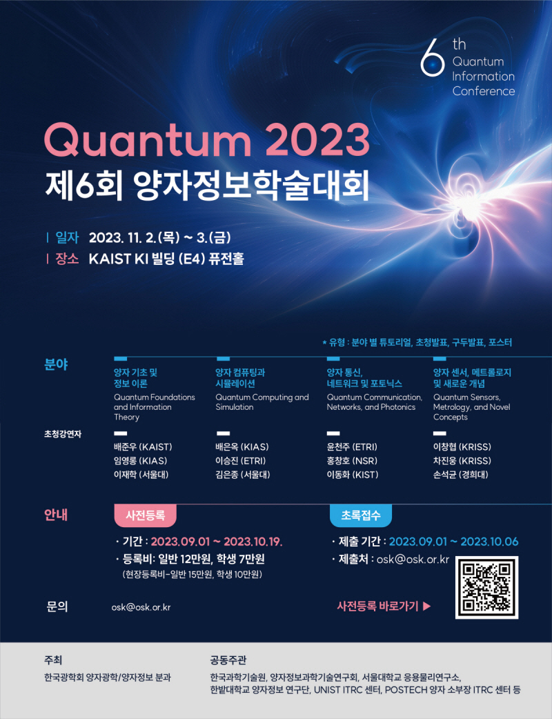 양자정보학술대회는 국내 양자정보 분야 연구자들을 위한 정기적인 학술교류의 장으로서 2018년 시작되여 2022년 5회 대회까지 성공적으로 이어지고 있습니다. 2023년 제6회 양자정보학술대회는 오는 11월 2일과 3일 양일간 대전 KAIST에서 오프라인으로 개최됩니다. 4개로 구분된 기술분과가 각각의 튜토리얼과 초청발표를 구성하며, 학술대회 전 기간 단일 세션으로 진행됩니다. 새로운 연구성과 발표와 공유를 촉진하기 위해, 선정된 소수의 투고논문에 대해 전체 세션에서 구두발표를 하실 기회를 드립니다. 포스터 세션 역시 연구성과에 대한 토론이 최대한 자유롭고 쾌적하기 이루어질 수 있도록 준비하고자 합니다. 양자정보 분야의 학계와 정부기관, 산업체에 속한 많은 분들이 최신 연구개발에 대해 소개하고, 지식과 함께 공동연구의 가능성에 대해 탐색하는 좋은 기회가 될 것으로 생각합니다. 관심 있는 분들의 많은 참여를 부탁드립니다.