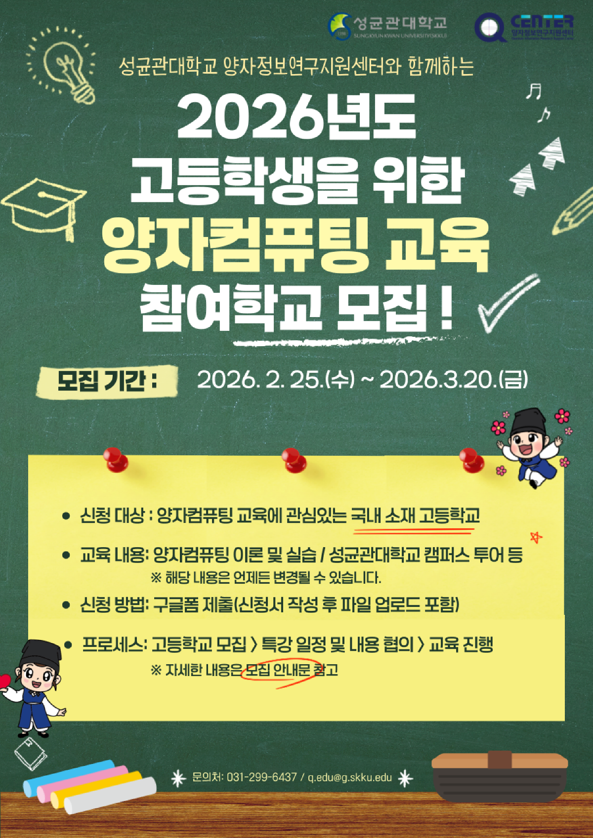 성균관대학교 양자정보연구지원센터에서는 과학기술정보통신부 「양자정보과학 인적기반 조성사업」의 일환으로 양자정보과학 분야 인적기반 조성을 위해 다양한 인력양성 사업을 운영하고 있습니다. 이와 관련하여 국내 소재 고등학교를 대상으로 미래유망기술 분야인 양자정보과학에 대한 흥미 부여 및 진로탐색의 기회를 제공하기 위한 양자컴퓨팅 교육을 지원하오니 많은 관심과 참여 바랍니다.