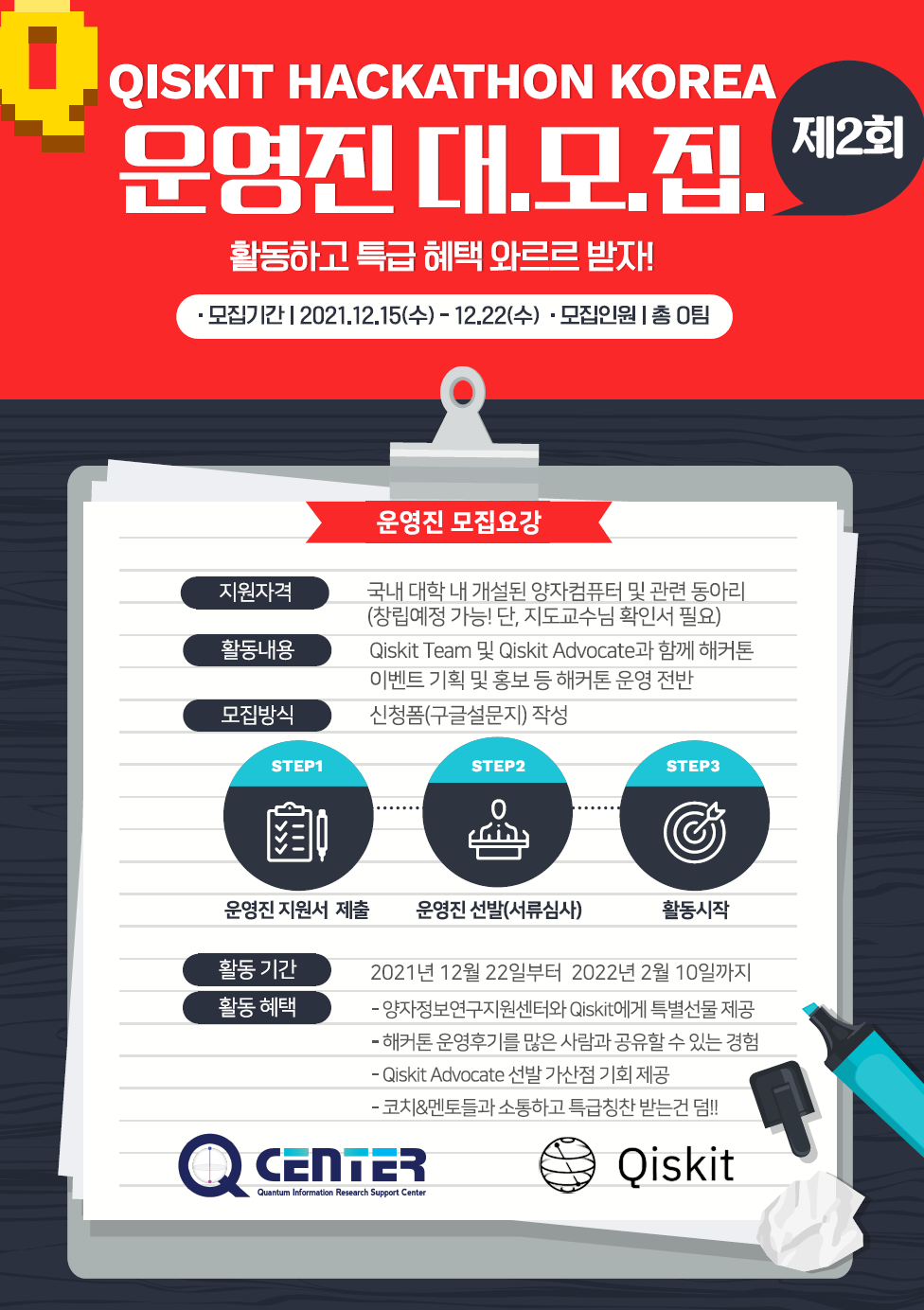 양자정보연구지원센터는 제2회 Qiskit Hackathon Korea를 함께해주실 운영진을
