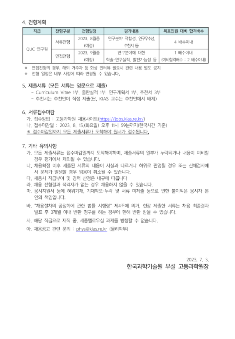 고등과학원 양자우주연구센터에서 연구원을 모집합니다.
