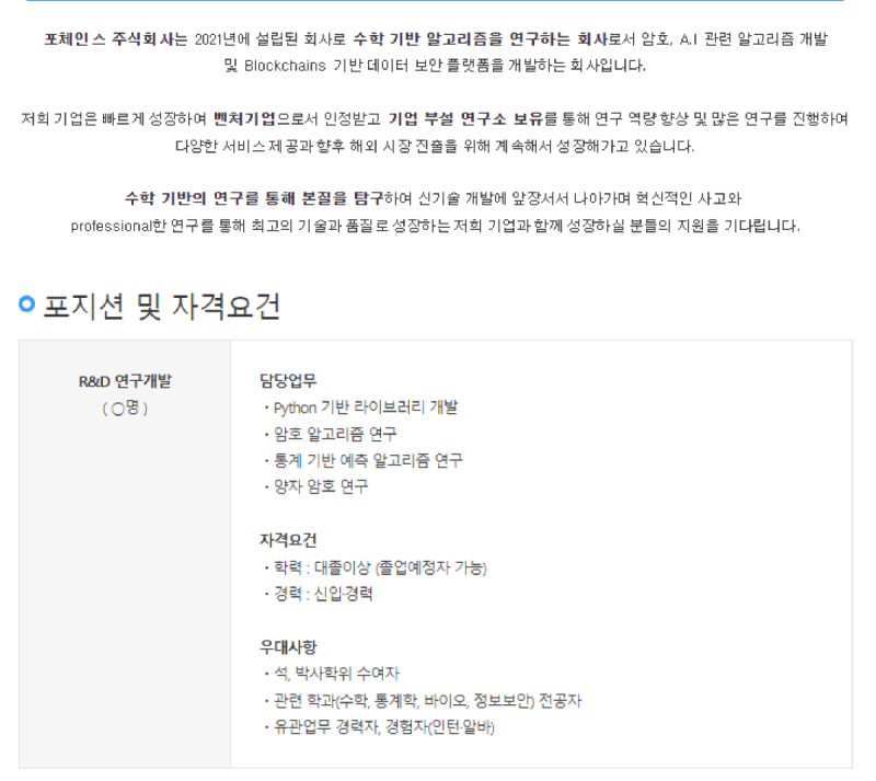 공고 홈페이지 : 포체인스 채용 - 자유로운 분위기의 포체인스(주)에서 함께 성장할 R&D연구개발 지원자를 모십니다. | 잡코리아 (jobkorea.co.kr)