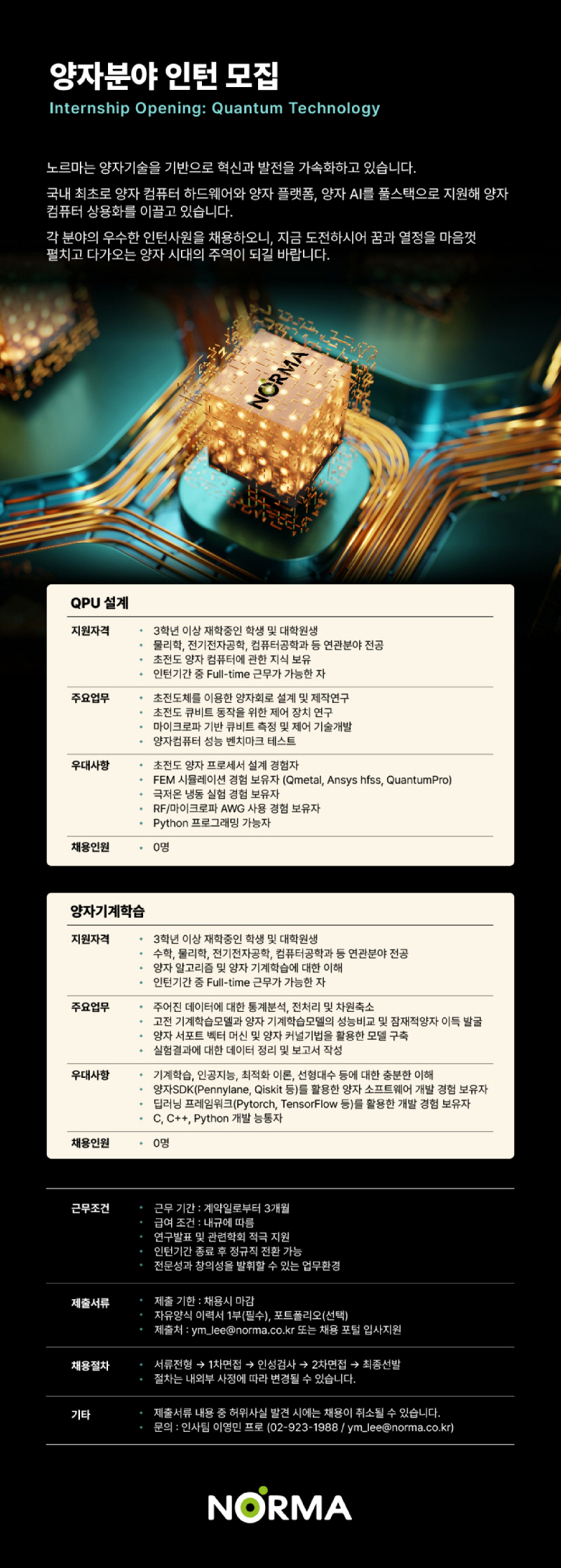노르마에서 양자 분야 인턴을 모집하오니, 많은 관심 바랍니다.