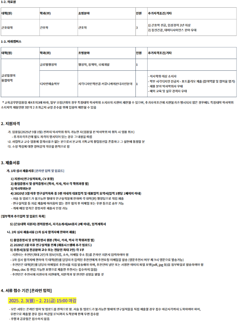 2025학년도 연세대학교 전임교원 초빙 공고
