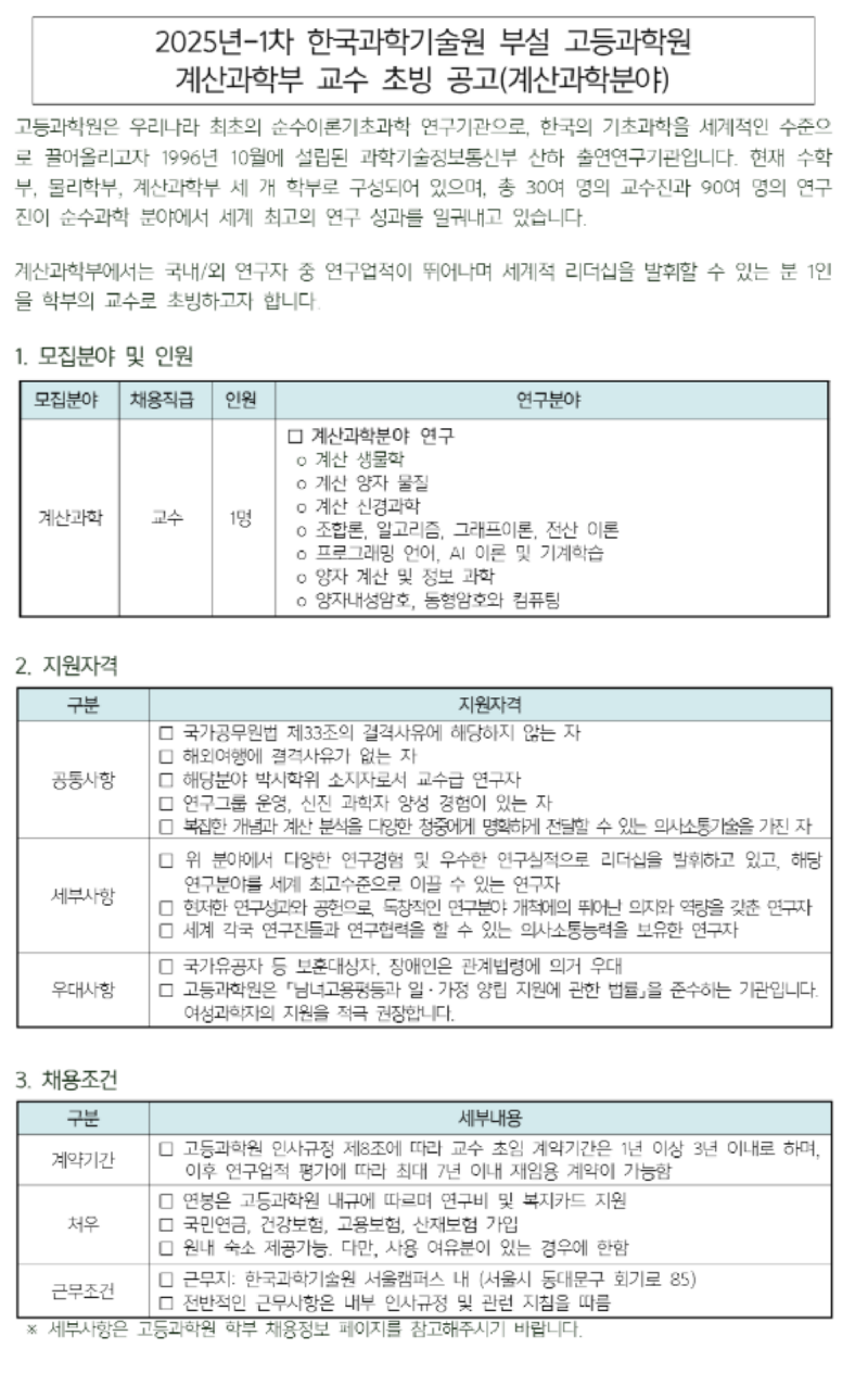 고등과학원 계산과학부 2025년 1차 교수 초빙(계산과학분야)