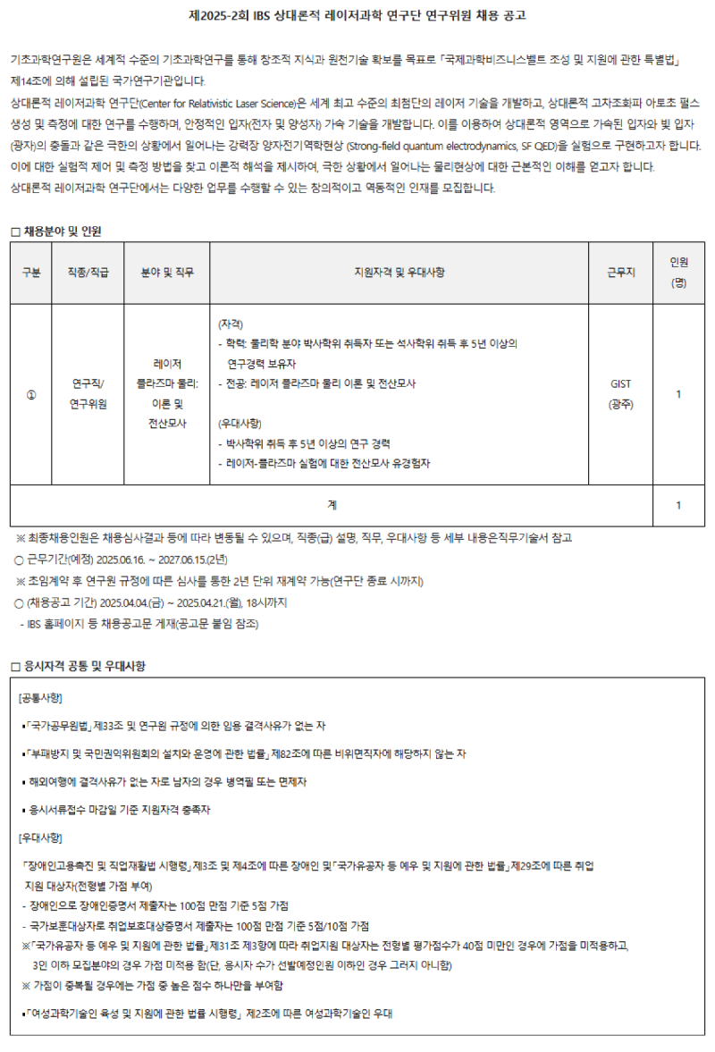 제2025-2회 IBS 상대론적 레이저과학 연구단 연구위원 채용 공고