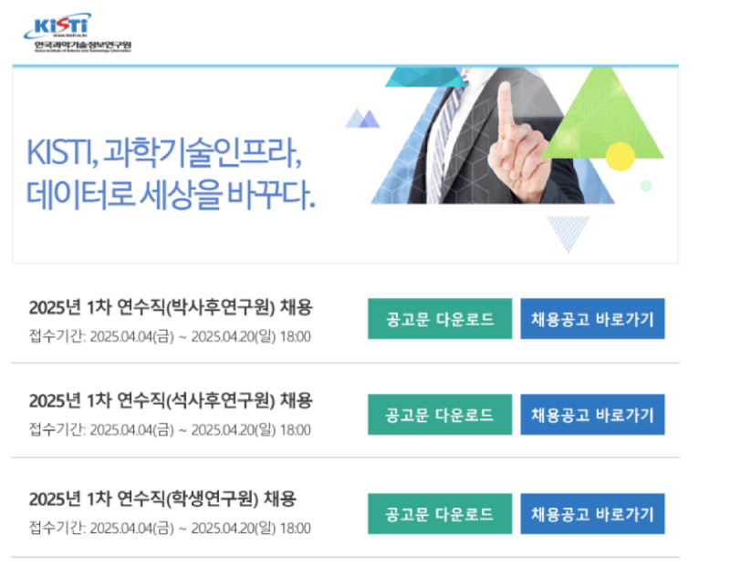 한국과학기술정보연구원 2025년 1차 연수직(박사후 연구원, 석사후 연구원, 학생연구원) 채용