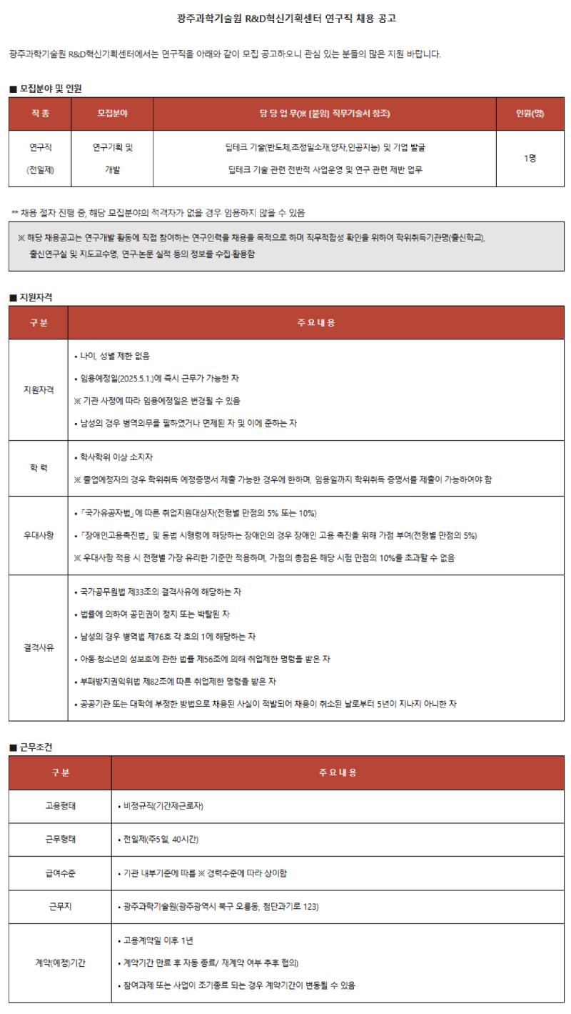 광주과학기술원(GIST) R&D혁신기획센터 계약직원 모집