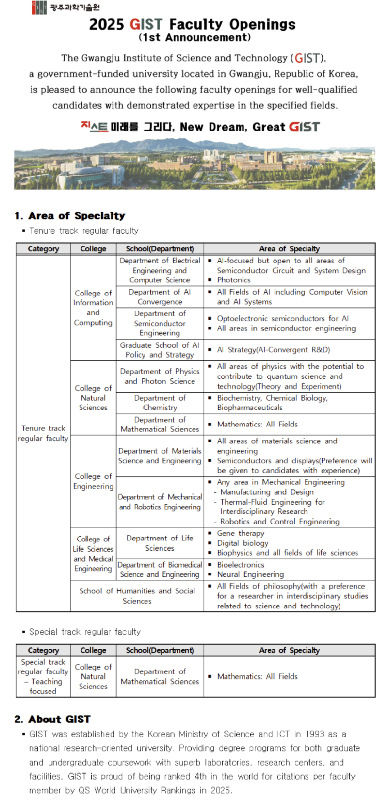 2025년도 제1차 광주과학기술원 전임교원 초빙 공고