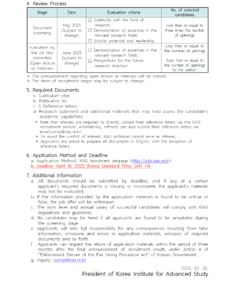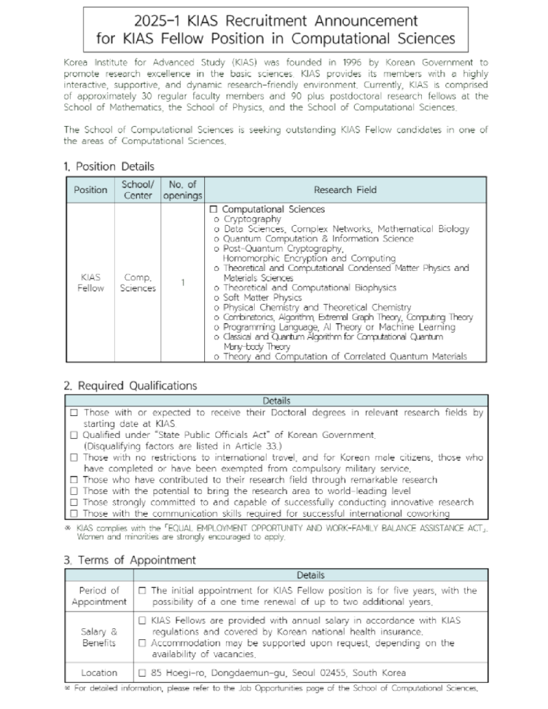 고등과학원 계산과학부 2025년-1차 KIAS 펠로우 초빙(계산과학분야)