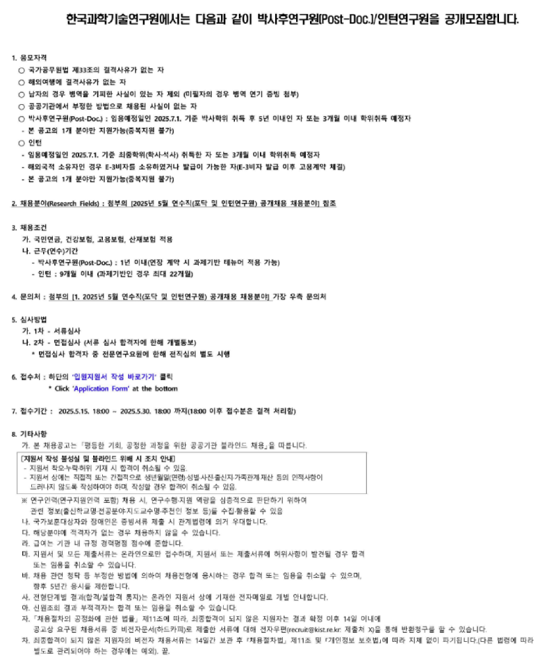한국과학기술연구원 2025년 5월 연수직(Post-Doc. 및 연구인턴) 공개채용