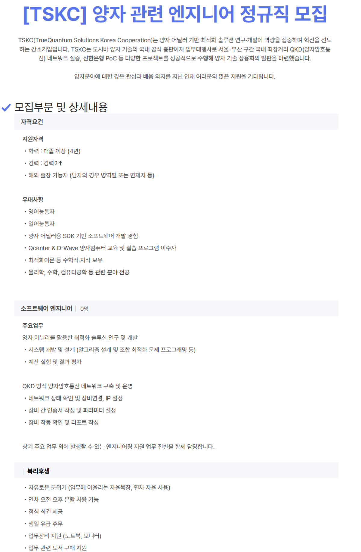 [TSKC]양자 관련 엔지니어 정규직 모집