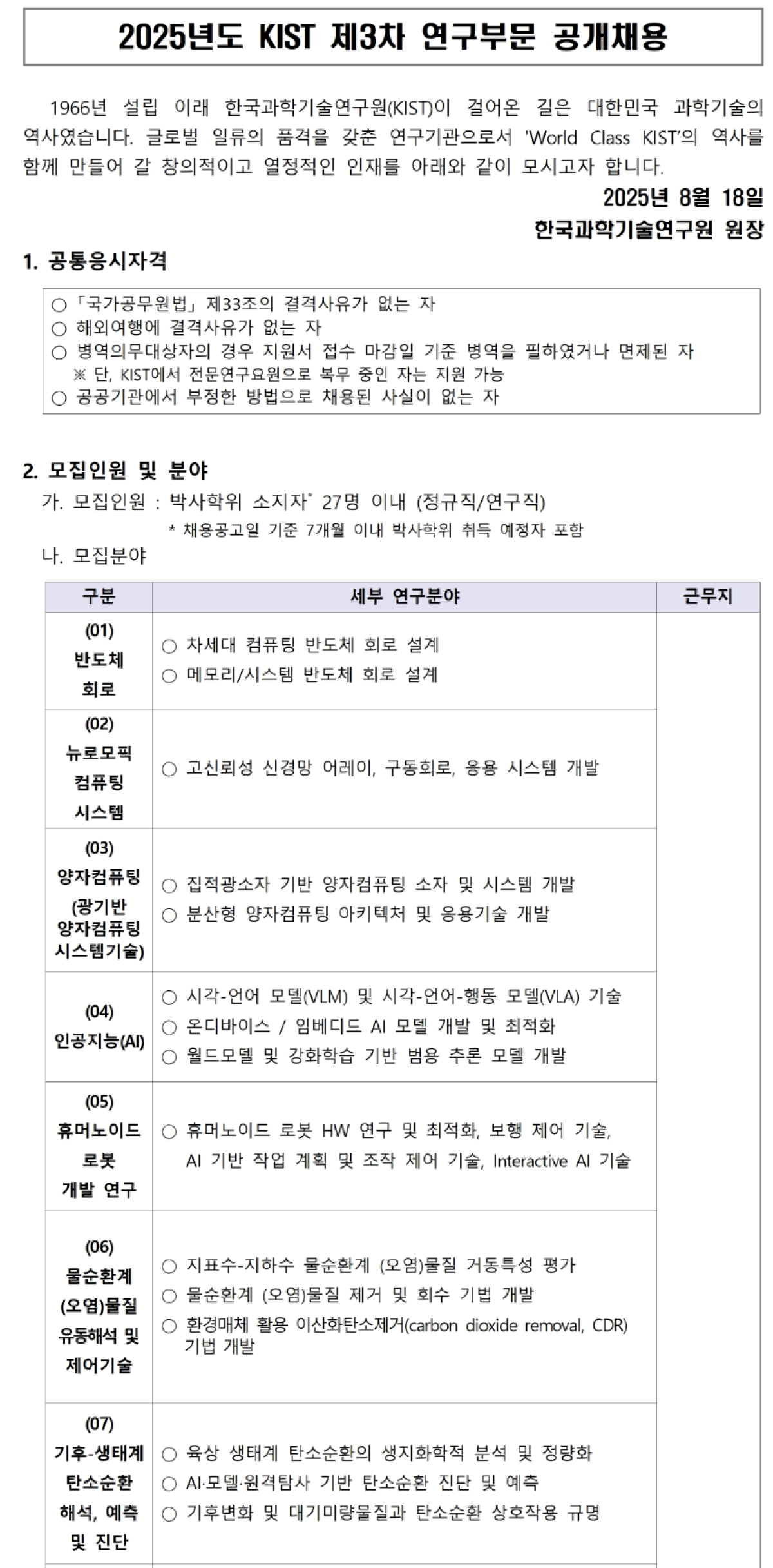 한국과학기술연구원 2025년도 제3차 연구부문 공개채용