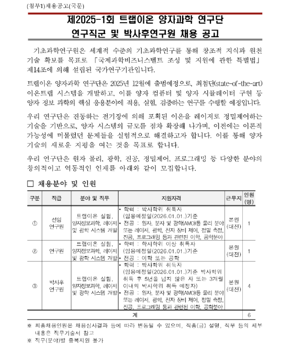 기초과학연구원 제2025-1회 트랩이온양자과학연구단 연구직군 및 Post-Doc. 채용