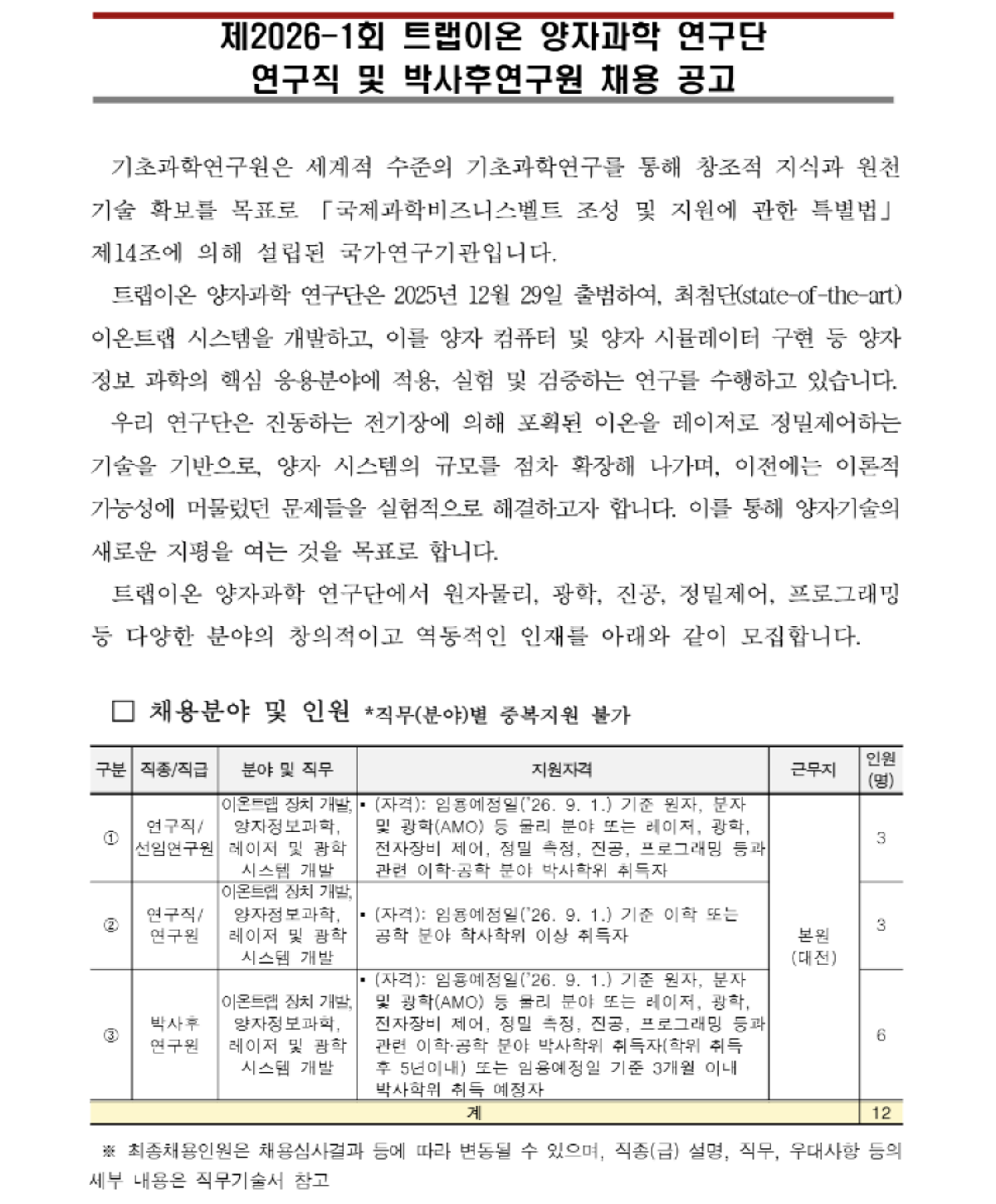 제2026-1회 트랩이온 양자과학 연구단 연구직 및 박사후연구원 채용 공고