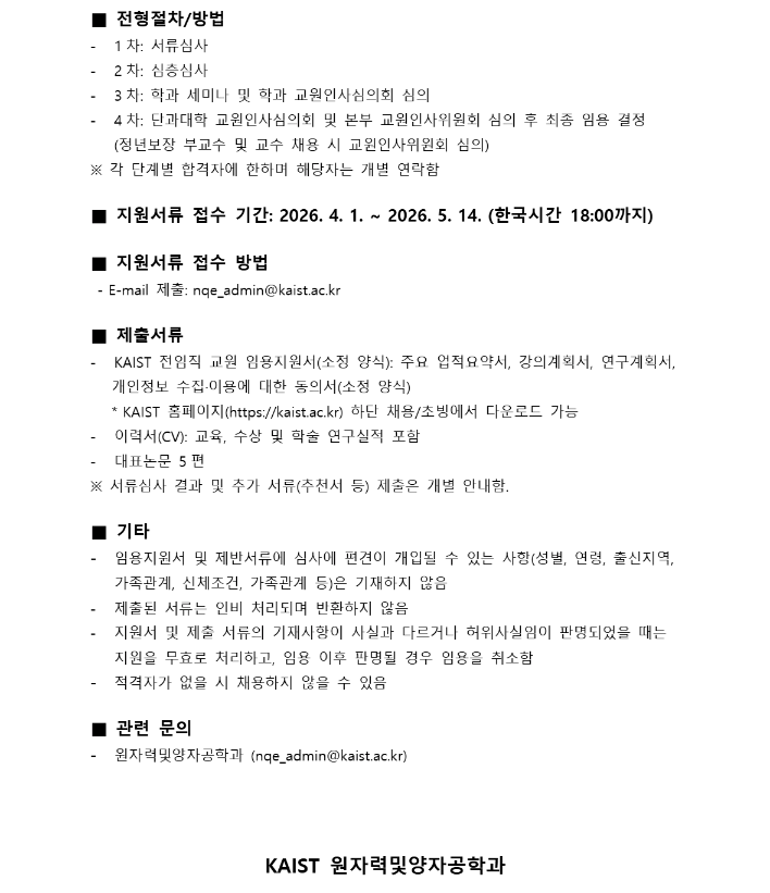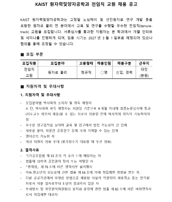 KAIST 원자력및양자공학과 전임직 교원 초빙