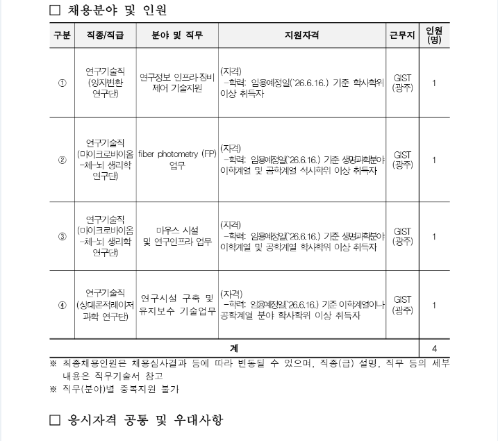 2026-2회 광과학 연구클러스터 연구직(연구기술원) 채용 공고(양자변환 연구단, 상대론적레이저과학 연구단, 마이크로바이옴-체-뇌 생리학 연구단)