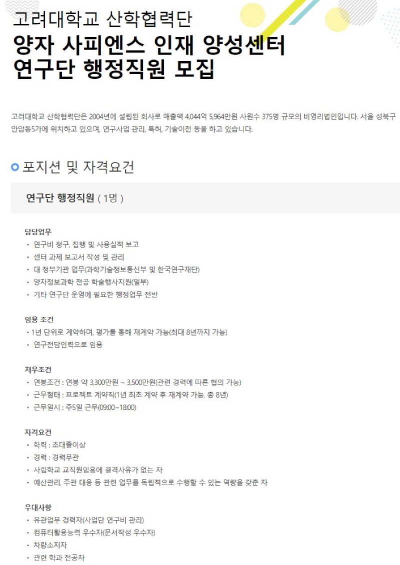 고려대학교 양자 사피엔스 인재양성센터 연구단 행정직원 모집