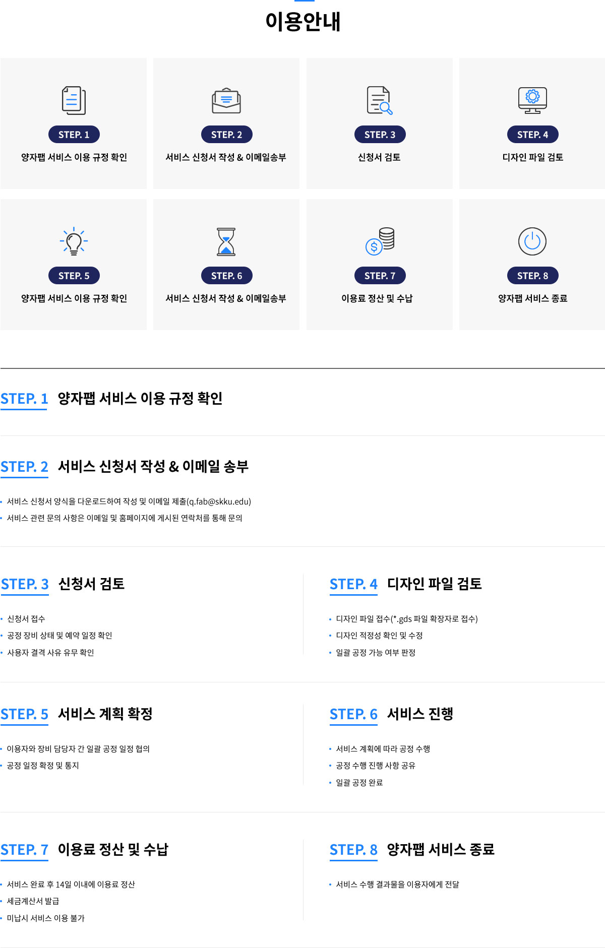 양자팹 전용 홈페이지를 이용하여 활용 가능 장비를 공개하며 대학, 연구소, 기업 대상으로 단위/일괄 공정 서비스를 제공하고 있습니다.