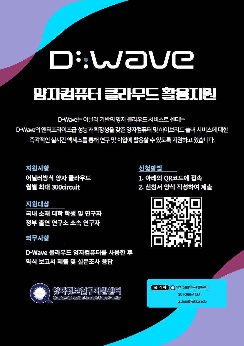 양자정보연구지원센터에서는 어닐러 기반 D-Wave 양자컴퓨터 클라우드를 활용 지원하고 있습니다. D-Wave 양자컴퓨터 클라우드를 사용하고자 하는 분들은 아래 [신청서] 또는 포스터의 QR코드에 접속하여 신청서를 제출하신 후, 신청서 와 재학(재직)증명서를 제출해 주시기 바랍니다.