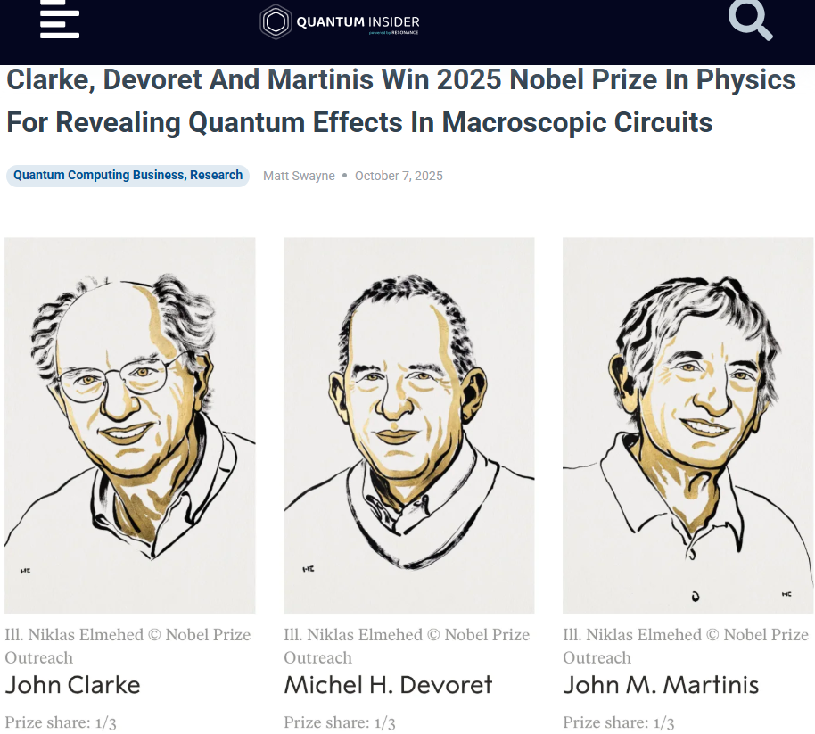존 클라크, 미셸 드보레, 존 마르티니스는 거시적 전기회로에서 양자 터널링과 에너지 양자화 현상을 발견한 공로로 2025년 노벨 물리학상을 수상했습니다. 이들의 1980년대 실험은 양자역학적 현상이 미시 세계를 넘어 거시적 규모에서도 발생함을 증명하며, 초전도 큐비트와 양자컴퓨터 기술의 기초를 마련했습니다. 이번 연구는 고전과 양자의 경계가 절대적이지 않음을 보여주며, 현대 양자정보과학 발전의 토대를 확립한 역사적 성과로 평가되고 있습니다.