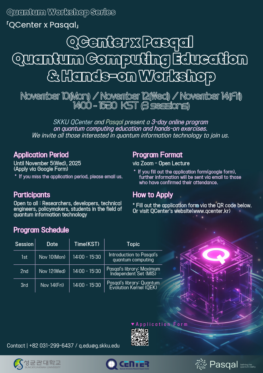 성균관대학교 양자정보연구지원센터와 Pasqal이 함께하는 3일 과정의 '온라인 양자컴퓨팅 교육 및 실습 프로그램'입니다.