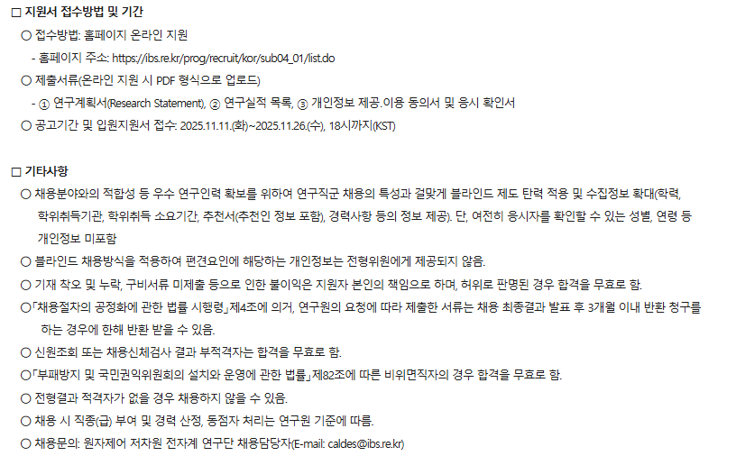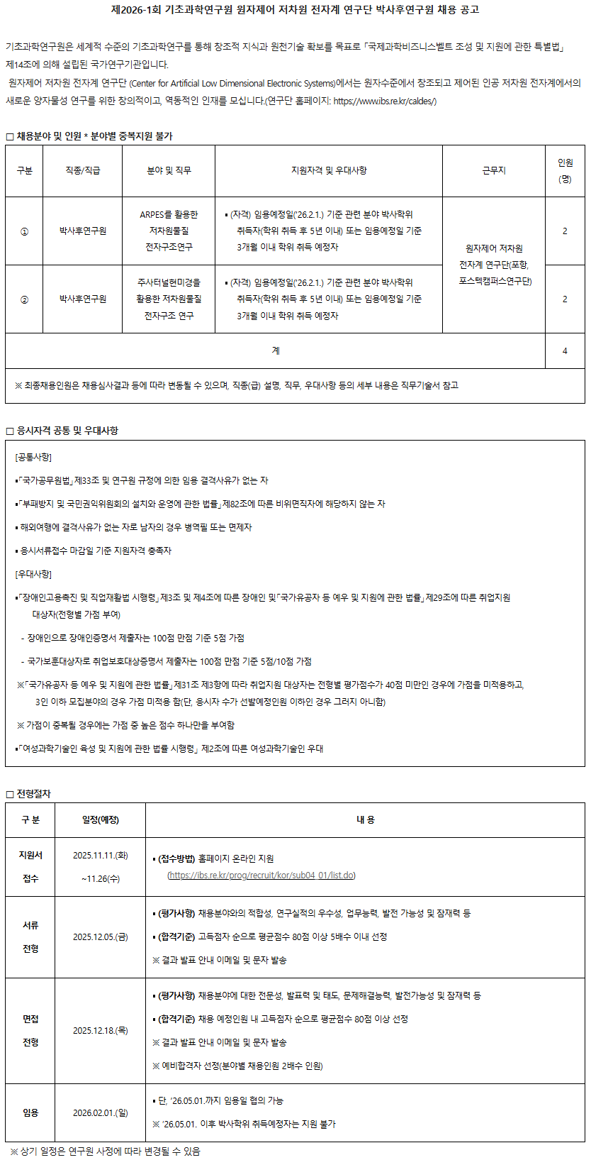 제2026-1회 기초과학연구원 원자제어 저차원 전자계 연구단 박사후연구원 채용 공고